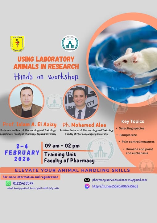 قدم الورشة كل من أ.د/اسلام احمد استاذ و رئيس قسم علم الادوية والسموم بكلية الصيدلة جامعة الزقازيق و م.م./سامي صلاح مدرس مساعد بقسم علم الادوية والسموم بكلية الصيدلة جامعة الزقازيق