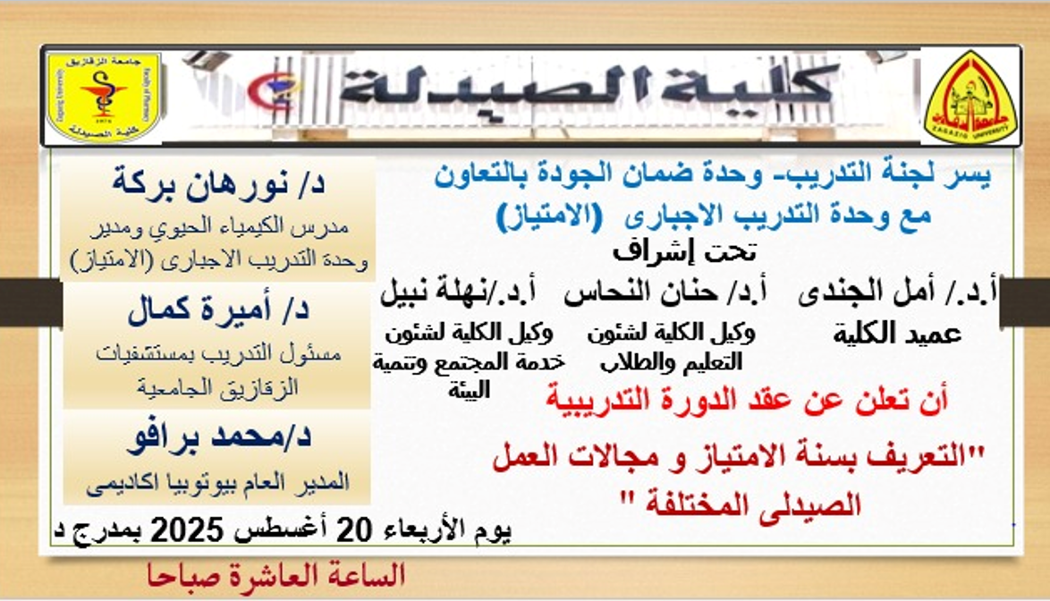 دورة تدريبية لتعريف الطلاب بسنة التدريب الإجباري (الامتياز) ومجالات العمل الصيدلي المختلفة لعام 2025-2026