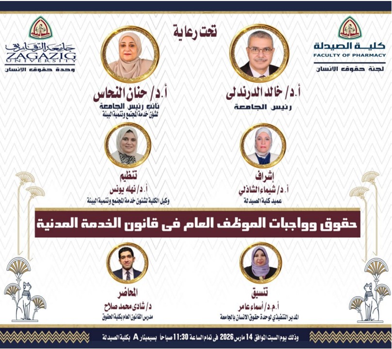 في إطار حرص الجامعة على تنمية الوعي القانوني والمهني لدى كوادرها الإدارية، وتحت رعاية معالي الأستاذ الدكتور/ خالد الدرندلي - رئيس الجامعة، ومعالي الأستاذ الدكتور/ حنان النحاس - نائب رئيس الجامعة لشئون خدمة المجتمع وتنمية البيئة، وبإشراف الأستاذ الدكتور/ شيماء الشاذلي - عميد كلية الصيدلة، والأستاذ الدكتور/ نهله يونس - وكيل كلية الصيدلة لشئون خدمة المجتمع وتنمية البيئة، نظمت لجنة حقوق الانسان بكلية الصيدلة بالتعاون مع وحدة حقوق الانسان بالجامعة ووحدة ضمان الجودة بكلية الصيدلة ندوة بعنوان "حقوق وواجبات الموظف العام في قانون الخدمة المدنية" وذلك يوم السبت الموافق 14 مارس 2026 بكلية الصيدلة والتي استهدفت تسليط الضوء على الأطر التشريعية التي تنظم العلاقة بين الموظف وجهة عمله وفقاً لقانون الخدمة المدنية. جاء ذلك بحضور ا. د / نهله يونس و ا. م/ أسماء عامر- مدير وحدة حقوق الانسان بالجامعة والسادة مديري عموم كليات الصيدلة والهندسة وعدد من أعضاء الجهاز الاداري بكليات الصيدلة والهندسة والعلوم والطب البشري.